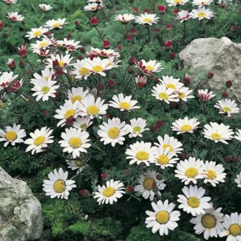 • мелкие цветы с желтой сердцевиной и белыми лепестками, обратная сторона которых имеет бордовую окраску. Растение, полученное из семян анациклюса, не вырастает выше 10 см. Это отличный почвопокровник с высокими эстетичными данными. На ночь и в дождь соцветия остаются закрытыми. Растение нуждается в большом количестве солнечного света. Для посадки рассады анациклюса подходит каменистая почва.