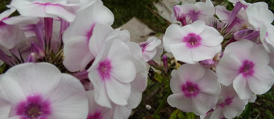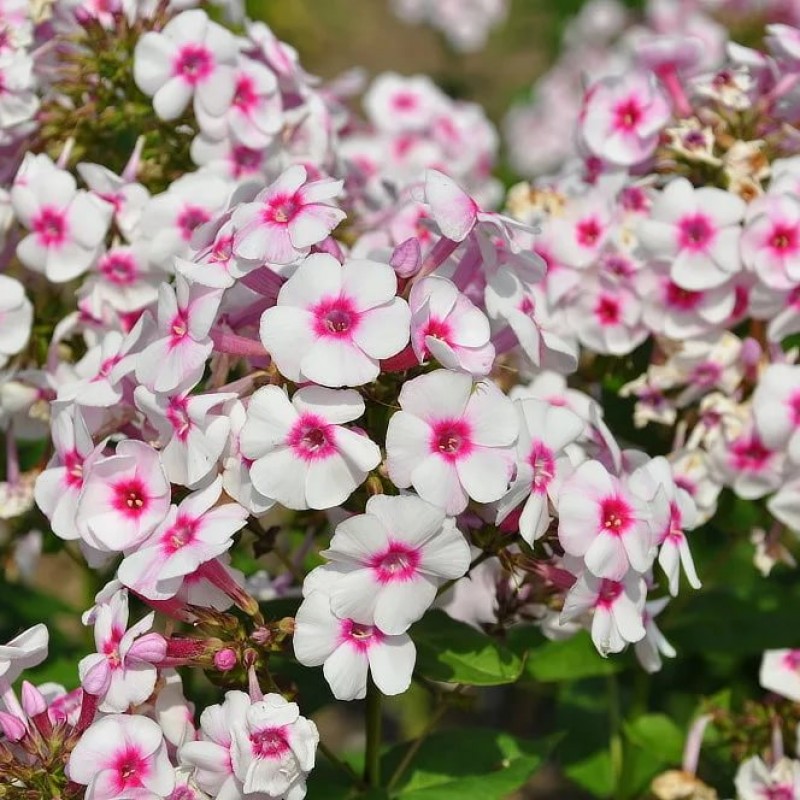 - приятный сладковатый аромат. Цветки флокса метельчатого Граф Цеппелин очень нарядные, белого-розового цвета с яркой малиновой звездочкой по центру. Семена могут проращиваться для получения рассады. Этот сорт обладает отличной зимостойкостью, практически не привлекает внимание вредителей, редко болеет.