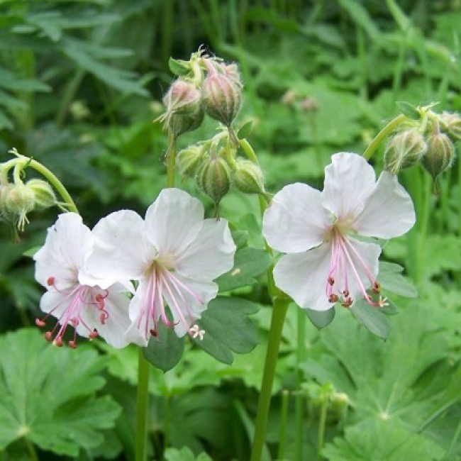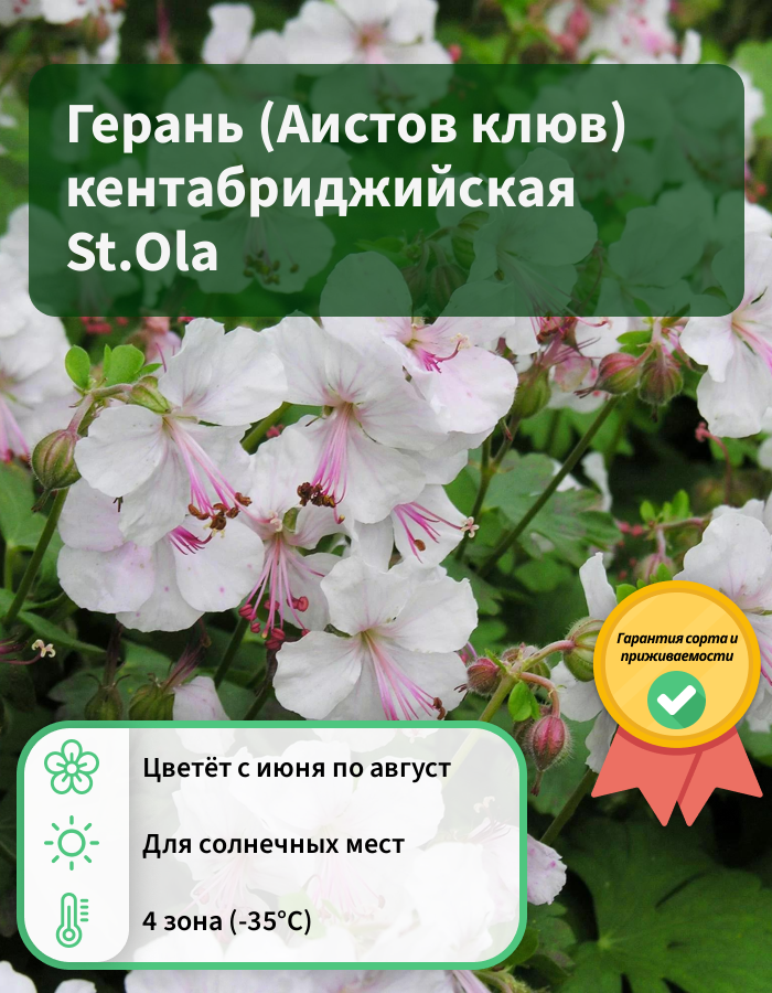 Рассада герани кентабриджийской St.Ola (Аистов клюв Geranium cantabrigiense St.Ola) широко используется цветоводами для оформления участков в природном стиле. Кустики низенькие, высотой не более 30 см, плотные, с зелеными листьями. Цветы распускаются в июне – июле. Они белого окраса, с отогнутыми назад лепестками. После отцветания цветы приобретают розоватый оттенок. Чтобы цветение было обильнее и длилось как можно дольше, герань кентабриджийскую St.Ola рекомендуют высаживать на солнечные участки или места с рассеянным освещением. К почве растение неприхотливо.