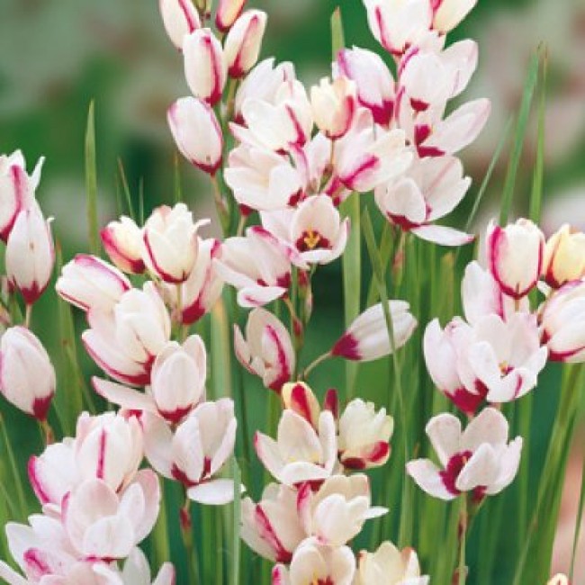 Иксия гибридная спотлайт - это удивительное растение с белыми цветками, украшенными розовыми пятнами, создающими неповторимый пестрый узор. Ее ствол нежный, листья формы и размера, которые придают ей особый шарм. Высота этого растения может достигать до 45 см, что делает его идеальным для оформления клумб, рабаток или контейнеров на террасе.
