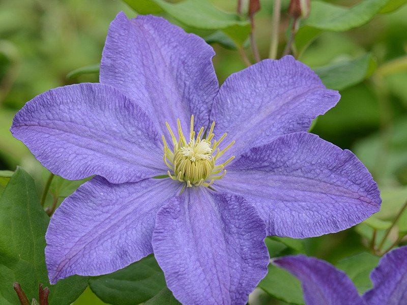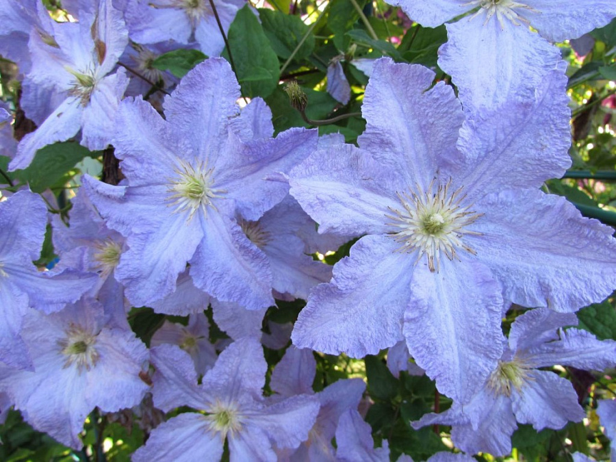 Цветёт на побегах текущего года. Цветение начинается в июне и особенно сильным становится в августе. Цветки очень крупные, диаметром 15…20 см, плоские. Чашелистиков от 4 до 7, они широкоовальные с загнутым заостренным кончиком и выраженной средней полосой, на которой видны три бороздки. Окраска чашелистиков светло-сиреневая или фиолетово-голубая, средняя полоса обычно светлее. На кончике чашелистика может быть желтоватый или красноватый мазок. Тычиночные нити кремовые, пыльники светло-желтые.