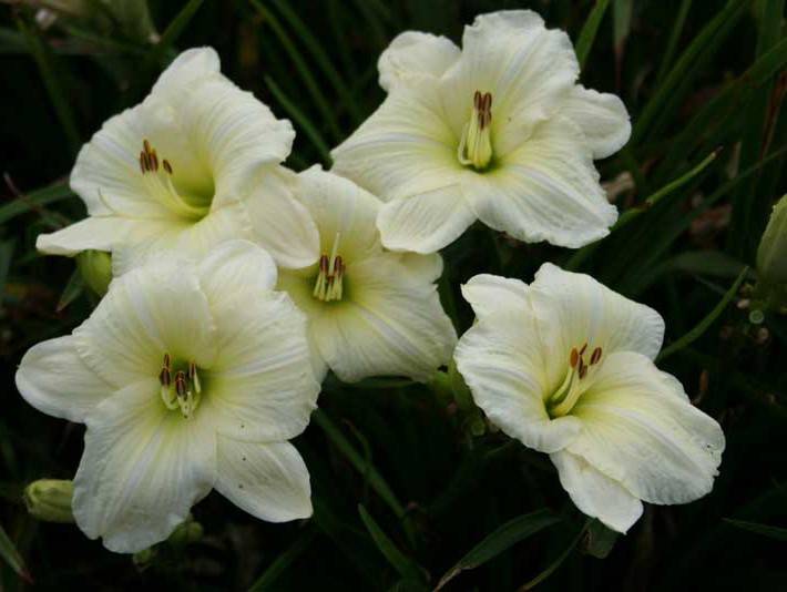 Рассада лилейника Джоан Сеньор (Joan Senior) – редкий сорт с ремневидными листьями темно-зеленого цвета. Цветы растения белые, лепестки текстурные широкие с лимонной сердцевиной, они отогнуты наружу. На лепестках образуются прожилки почти такого же цвета, как и сам цветок, лишь слегка выделяясь. Стрелки на внутренних лепестках выражены менее сильно. Цветы появляются в период с июля по август. Рассада Джоан Сеньор хорошо подойдет для оформления групповых посадок и ландшафта на берегу водоемов. Также она отлично дополняет хосты, ирисы. Эти лилейники обязательно должны расти на хорошо освещенном участке, на ровной местности или на склонах, где не скапливается вода. Растение хорошо перенесет зиму под толщей снега, поэтому совсем не нуждается в дополнительном укрытии.