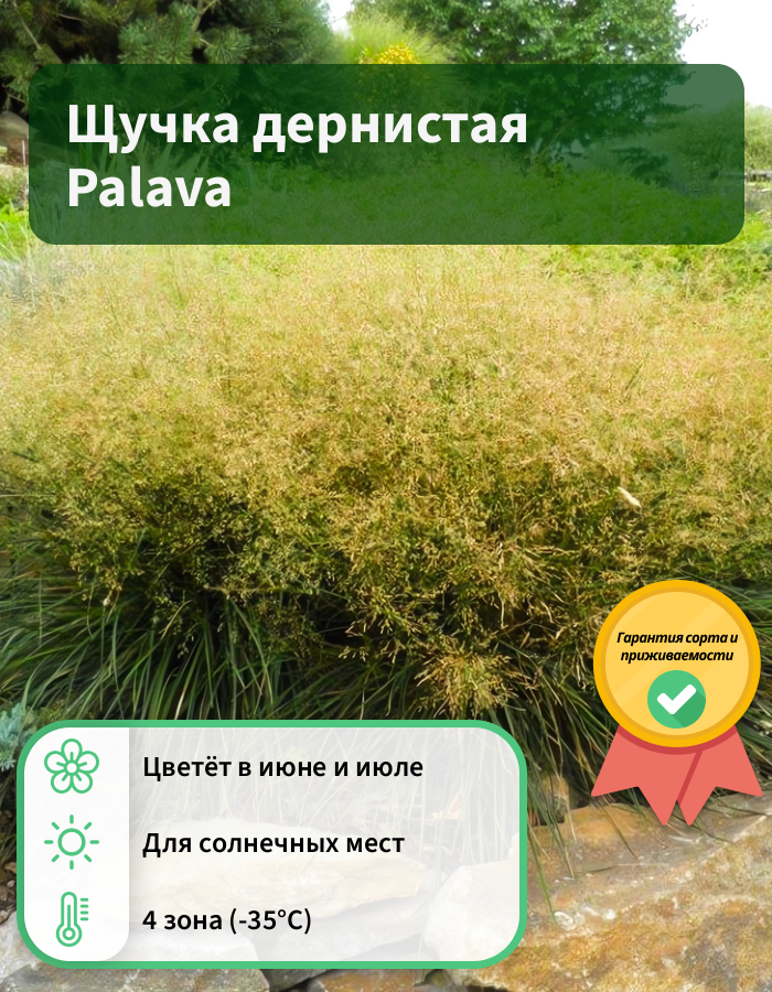 Рассада щучки дернистой Palava (Deschamsia cespitosa) относится к растениям холодносезонного характера роста. Трава начинает расти рано весной при довольно низких температурах. Высаживать рассаду рекомендуют во влажную почву на частично освещенные участки. Взрослый кустик отличается компактными размерами. В высоту щучка дернистая Palava достигает 30-40 см, а в ширину 30-50 см. Цветки распускаются чаще всего в конце июня, реже — в середине июля. Они собираются в рыхлые метелки, которые меняют свой цвет по мере развития: с серо-бежевого до желто-оранжевого в конце лета.