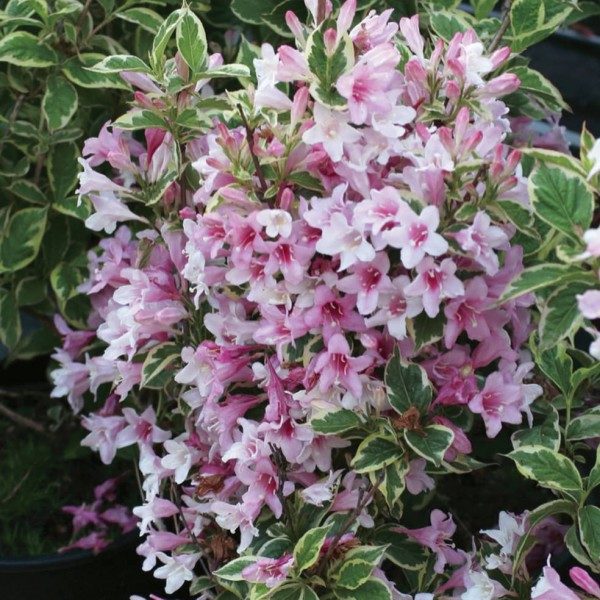 Саженцы вейгелы цветущей Нана Вариегата (Nana Variegata) придутся кстати для множества композиционных решений — от одиночных высадок до контрастных композиций, хорошо смотрятся на фоне ухоженной газонной травы. Кустарник поднимается до полутора метров вверх, разрастаясь на 2 метра в диаметре. Листья — одна из декоративных составляющих этого растения: ярко-зелёный основной окрас со светло-кремовой каёмкой. Цветы появляются в мае-июле — крупные, трубчато-колокольчатой формы, от светло-розового до розово-фиолетового оттенков. Возможна покупка крупномера вейгелы цветущей Нана Вариегата. Негативно реагирует на уплотнение почвы.